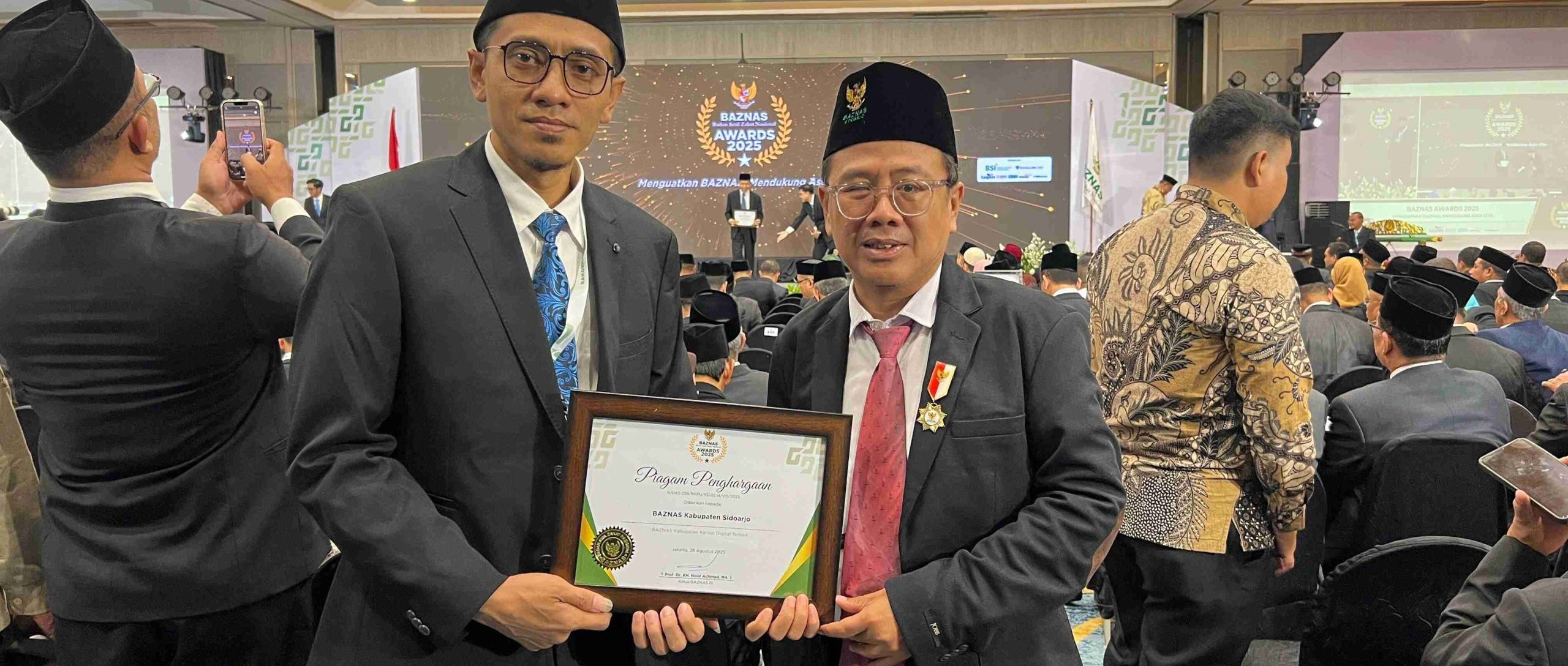 Penghargaan tersebut diserahkan langsung dalam sela-sela Rapat Koordinasi Nasional (RAKORNAS) BAZNAS RI 2025 di Jakarta yang berlangsung sejak 26 Agustus lalu. Ketua BAZNAS Kabupaten Sidoarjo, M Chasbil Aziz Salju Sodar yang akrab disapa Gus Jazuk, hadir langsung menerima penghargaan tersebut.