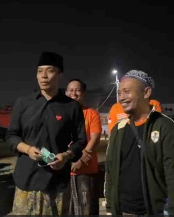 Dengan pakaian khas santri — kemeja hitam dan sarung batik — Gus Kautsar tampak tenang namun penuh empati. Ia menyapa satu per satu relawan, memegang masker hijau muda di tangannya sambil mengangkat dua jari sebagai isyarat salam dan doa. Di tengah hening malam yang hanya diterangi lampu sorot, ia berbicara dengan suara pelan namun penuh kekuatan: