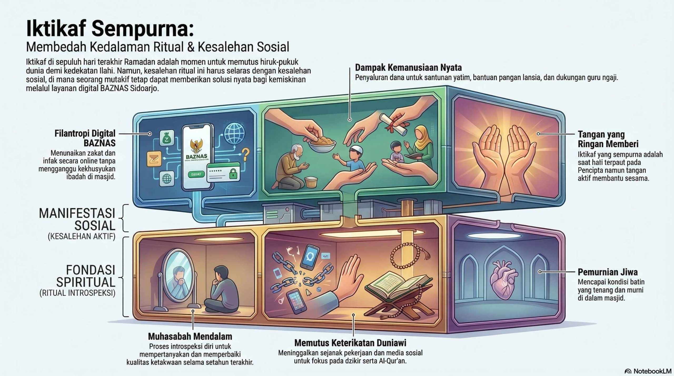 Inilah yang kita sebut sebagai keselarasan antara ritual dan sosial. Dalam narasi filantropi BAZNAS Sidoarjo, iktikaf mengajarkan kita pengendalian hawa nafsu. Kesadaran bahwa kita adalah hamba yang lemah di hadapan Allah seharusnya bermuara pada kerelaan untuk membantu mereka yang lebih lemah secara ekonomi. Iktikaf yang sempurna adalah ketika hati terpaut pada Sang Pencipta, namun tangan tetap aktif memberikan solusi bagi sesama.