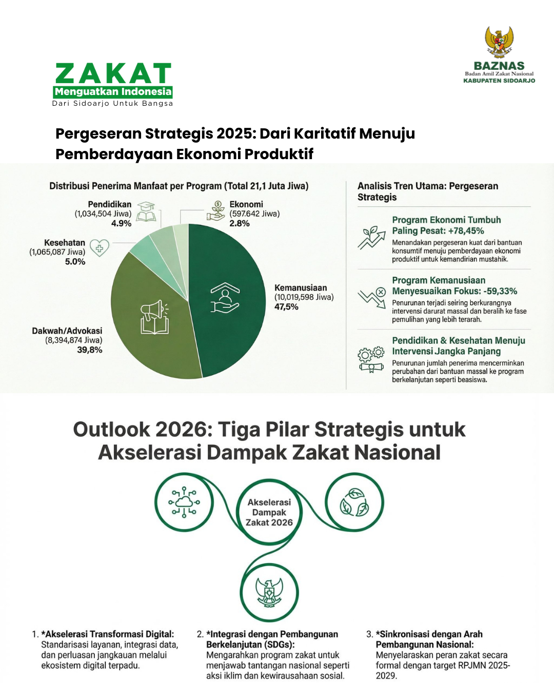 Visi 2026 adalah mengubah mustahik menjadi muzaki. Kita telah melihat pergeseran strategis yang luar biasa, di mana program pemberdayaan ekonomi tumbuh paling pesat (+78,45%). Dengan dukungan 740 Organisasi Pengelola Zakat (OPZ) yang semakin solid, jangkauan zakat hingga ke level desa melalui 1.423 UPZ Desa akan memastikan bahwa zakat kembali ke desa untuk membangun kemandirian lokal.