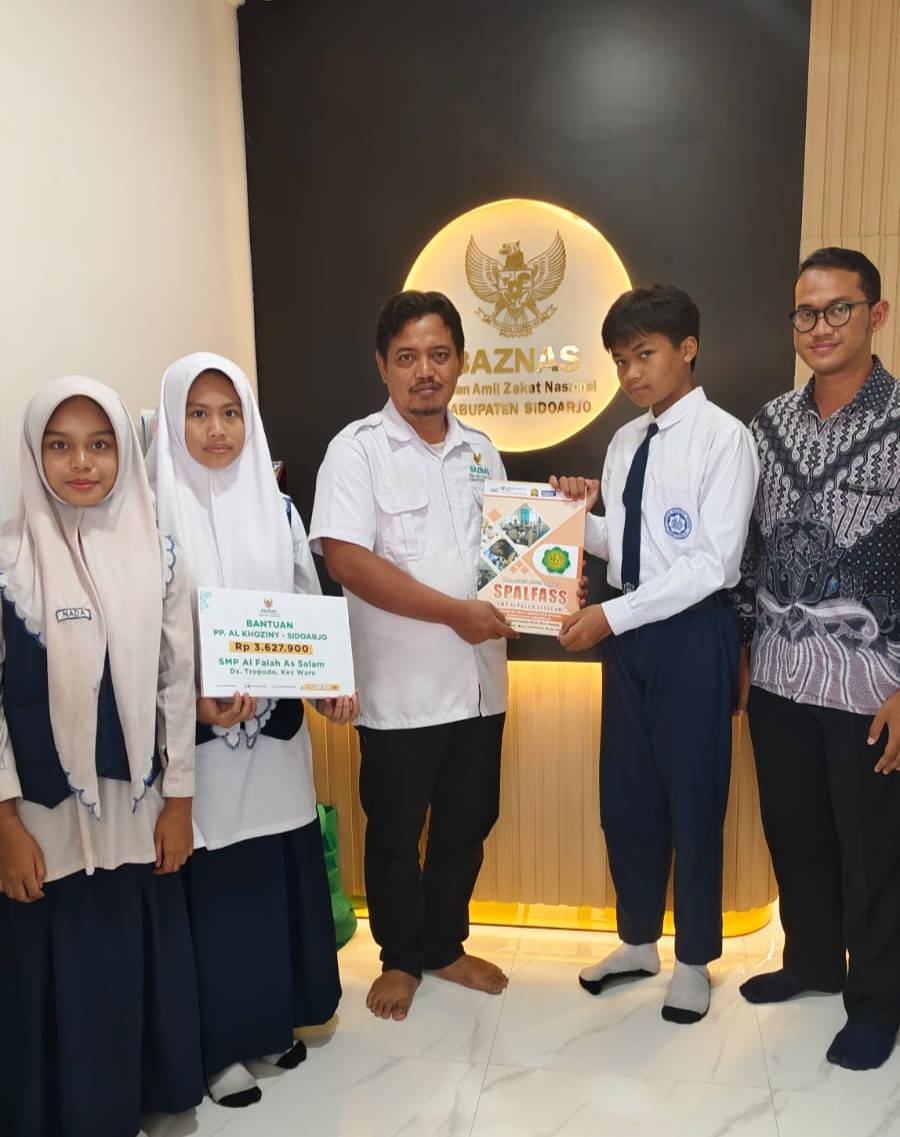 SIDOARJO — Di tengah reruntuhan yang masih menyisakan luka, harapan mulai terbangun kembali. Donasi senilai Rp 3.627.900 dari siswa dan civitas akademika SMP Al Falah As Salam, Ds. Tropodo, Kec. Waru, menjadi simbol kepedulian nyata yang mengalir dari generasi muda untuk saudara-saudara mereka di Pondok Pesantren Al-Khoziny yang tertimpa musibah runtuhnya musholla. Penyerahan donasi ini dilakukan secara simbolis oleh Ustad Farkhan, Wakil Kepala Bidang Kesiswaan, bersama perwakilan siswa, langsung kepada staf pelaksana BAZNAS Sidoarjo, Abdulghoni, di kantor BAZNAS Kabupaten Sidoarjo, Senin (13/10/2025).