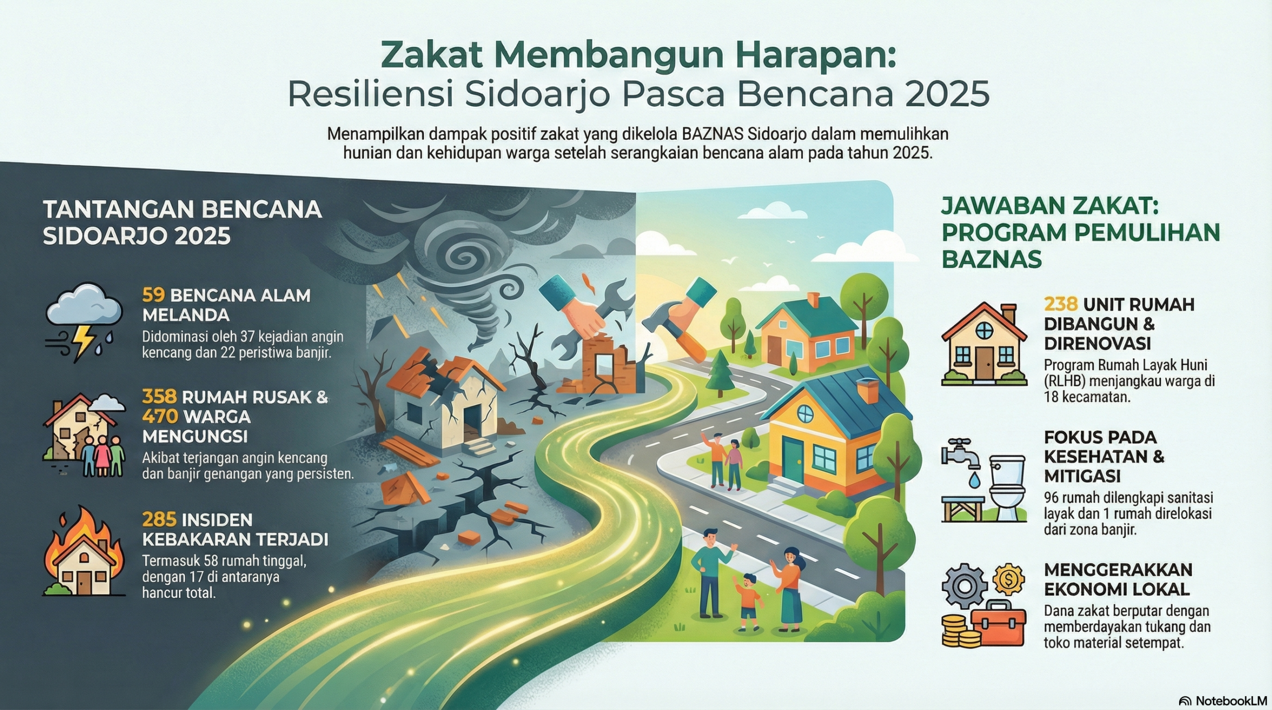 Tahun 2025 akan senantiasa dikenang sebagai lembaran refleksi mendalam bagi segenap masyarakat Kabupaten Sidoarjo. Di tengah dinamika pembangunan, alam memberikan ujian ketangguhan fisik dan sosial yang luar biasa melalui rentetan bencana yang silih berganti. Berdasarkan catatan otoritas terkait, wilayah Kota Delta ini didera oleh 59 kejadian bencana alam yang didominasi oleh fenomena angin kencang sebanyak 37 kejadian serta 22 peristiwa banjir genangan,. Namun, di balik angka-angka statistik tersebut, terselip narasi kemanusiaan tentang bagaimana sebuah daerah bangkit dari puing-puing melalui kekuatan zakat yang dikelola secara inklusif dan berkelanjutan.